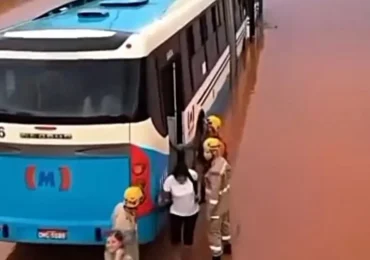 Chuva intensa transforma GO-070 em rio e deixa ônibus do Eixo Anhanguera ilhado