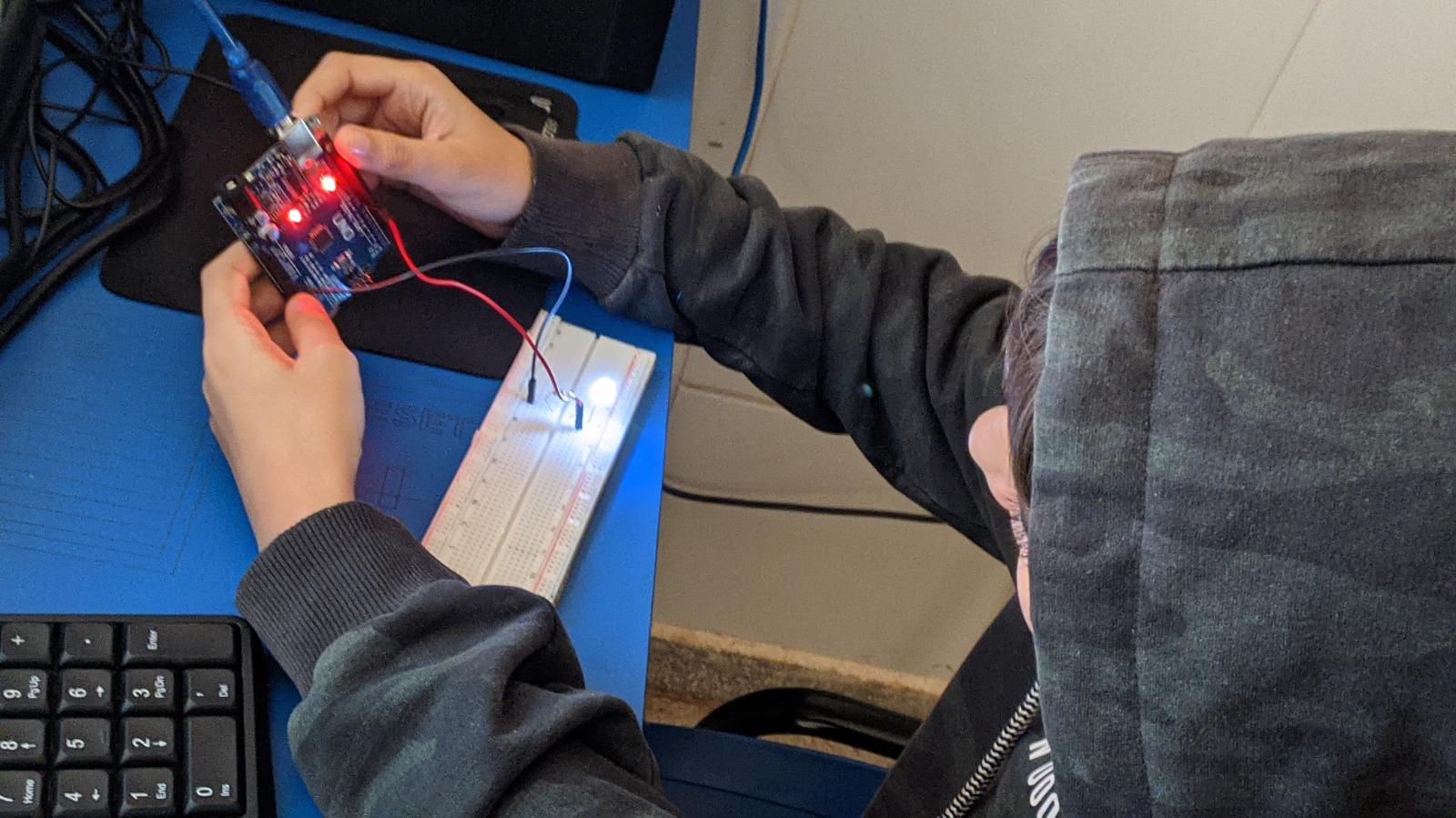 - Introdução à robótica, que apresenta aos estudantes os componentes, as placas de arduino, o protoboard e ensina a dar os primeiros passos na programação;