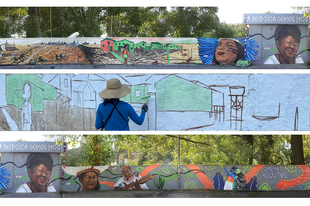 Os artistas do coletivo Mairi somam seu talento ao mural, com tintas multicoloridas. And Santtos, Cely Felize e Tai retratarão indígenas, quilombolas, ribeirinhos e populações periféricas que vivem em palafitas, com a frase “A solução somos nós”. Parte do mural, que será pintada pela artista indígena Cely Feliz será feita, inclusive, com detritos de esgoto e entulho de obra da COP30 na Vila da Barca.