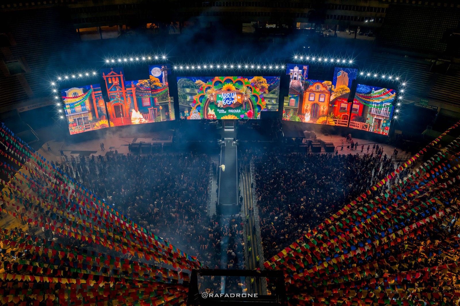 O palco tem um painel de LED gigante com a projeção de uma vila que remonta aos festejos na roça. Ao longo da animação, o cenário ganha imagens das igrejas históricas de Goiás, de símbolos como o monumento às três raças e a antiga estação ferroviária de Goiânia, entre outras imagens que reforçam a cultura e a memória das tradições no público presente.